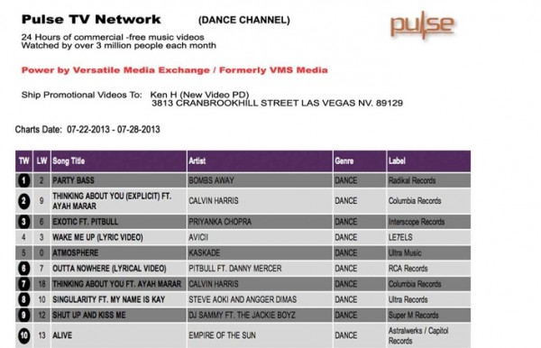 Pulse TV Network recently released their charts for the past week and Bombs Away pulled away with the #1 dance channel spot for their “Party Bass” video! Pulse is a 24 hour, commercial-free music video channel broadcasted to 3 million people each month. Check out the video for “Party Bass” below.