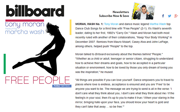 Tony Moran and dance music legend Martha Wash have been featured on Billboard’s Chart Beat for their new hit single “Free People,” which is currently number one on the Billboard Dance Club Chart. Tony Moran and Martha Wash were previously number one in December 2007 with their hit “Keep Your Body Working.” Remixes from Mauro Mozart, Casey Alva and John LePage, among others, who helped push “Free People” to the top.