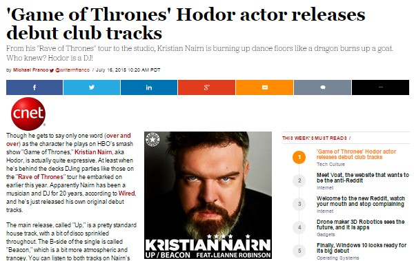Following the success of the Kristian Nairn‘s deep house track, “Up/Beacon“, he has been featured in an article on CNET.com! Known for being the loveable Hodor on the HBO seires Game of Thrones, Nairn has taken over the EDM community. Check out what CNET is saying about Nairn’s debut: