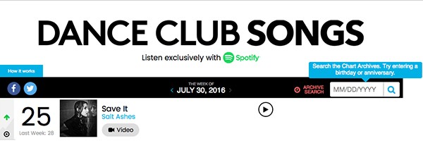 Emerging electronic singer-songwriter Salt Ashes has released her self-titled debut album this past Friday, July 15th. The lead single “Save It” is currently climbing the Billboard Dance Club Songs Chart. The single, which has been on the chart for 5 weeks, jumped 3 spots from last week landing in at #25. “Save It” lands just below “Cheap Thrills” by Sia feautring Sean Paul and “Special” by Lorenzo Spano featuring Liz Hill. Thank you to everyone has been supporting this single, and Salt Ashes’ debut album. Let’s try to get “Save It” to #1! Find the full Billboard Dance Club Songs Chart here.