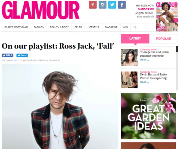Last month, emerging artist Ross Jack unveiled his new album ‘Self Medicated’ in North America. We are happy to see the the Johannesburg born recording artist has been featured in GLAMOUR South Africa. In the feature, GLAMOUR discusses Ross’ new album and their favorite track “Fall.” Read the feature below, or if your from South Africa pick up a copy of the magazine.